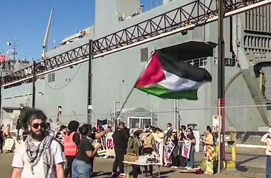 Pro-Palestinian protesters outside a large US military ship at the port of Oakland, Calif., on Friday, Nov. 3, 2023.