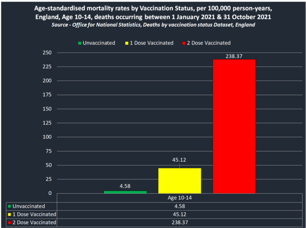 the report published by the Office for National Statistics on 20th Dec 21 inadvertently revealed that COVID-19-vaccinated children were up to 52 times more likely to die of any cause than unvaccinated children.