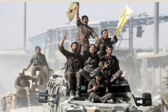 Syrian Democratic Forces (SDF) fighters ride atop military vehicles as they celebrate victory in Raqqa, Syria, October 17, 2017
