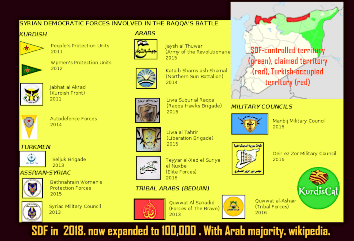 Though progressive and democratic the SDF forces, now majority Arabic, are always referred to as terrorists by Turkish and Syrian State based media, because the largest Kurdish segments the YPG and women’s YPJ support Abdullah Öcalan (the Nelson Mandela of the Kurds).