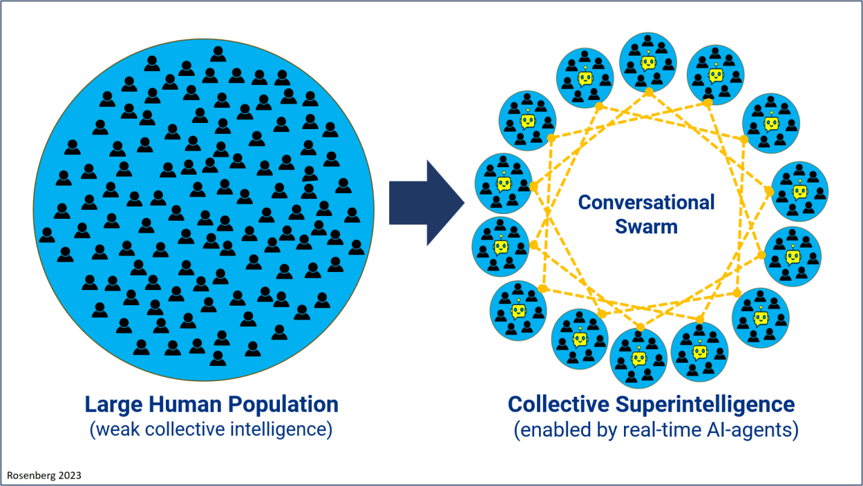 The resulting technology is called Conversational Swarm Intelligence (CSI) and it promises to allow groups of almost any size (200 people, 2,000 people, 2 million people) to discuss complex problems in real-time and converge on meaningful solutions that are amplified by the natural power of swarm intelligence”.