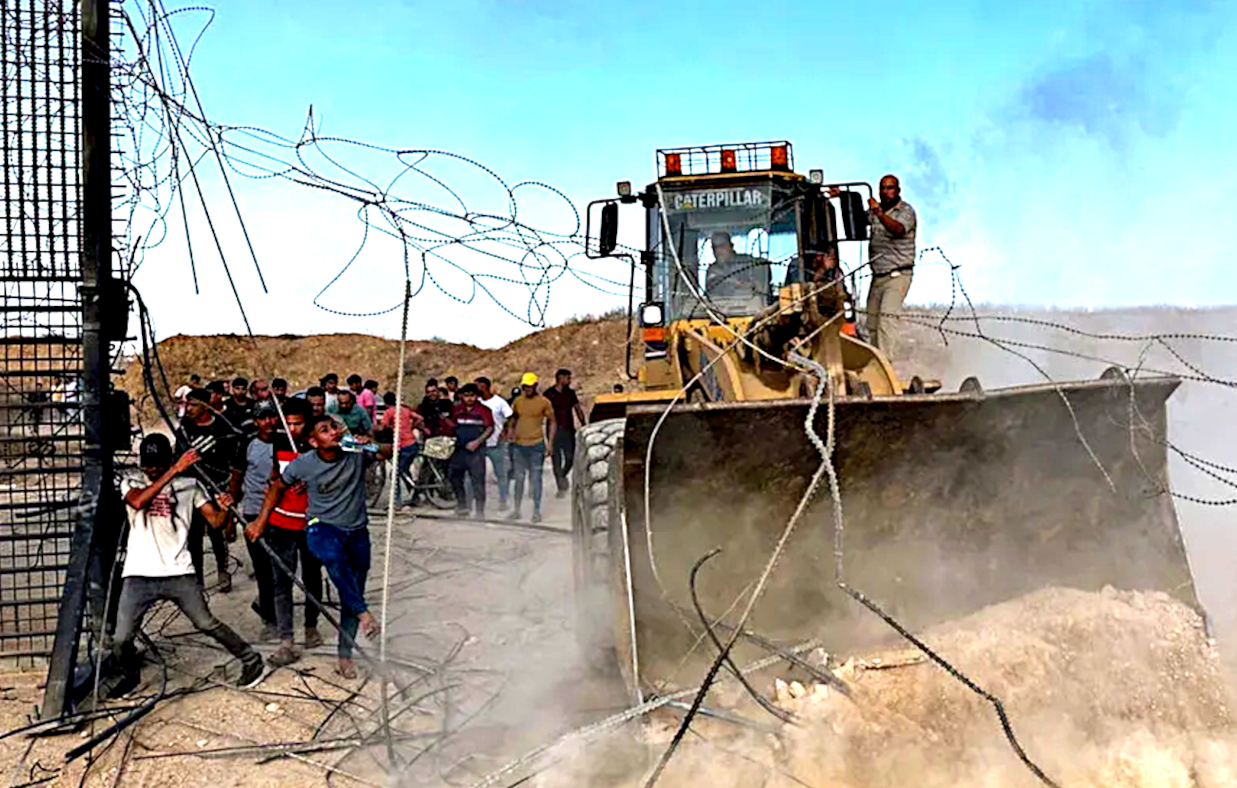 B).. Israeli soldiers surrounding world famous Gaza prison wall.A)..Palestinians driving a bulldozer through it..