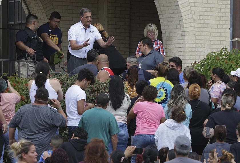 An administrator attempts to calm a crowd of parents and family members outside Thomas Jefferson High School in San Antonio, Texas, after what turned out out to be a false report of a classroom shooting.