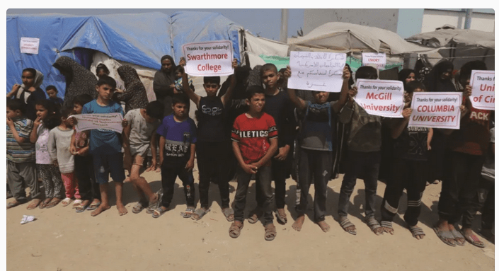 10:44 GMT Palestinians in Gaza have shown gratitude to those taking part in the US college protests, CNN has reported. It said that, over the past few days, children have been seen at refugee camps across the enclave, holding signs and banners featuring the names of different universities and captions like “thanks for your solidarity.”A doctor at al Aqsa Martyrs Hospital in the Palestinian enclave told the broadcaster that he was “over the moon” due to reports of protests because it meant “that around the world there are human beings who know what is happening here in Gaza Strip right now.”