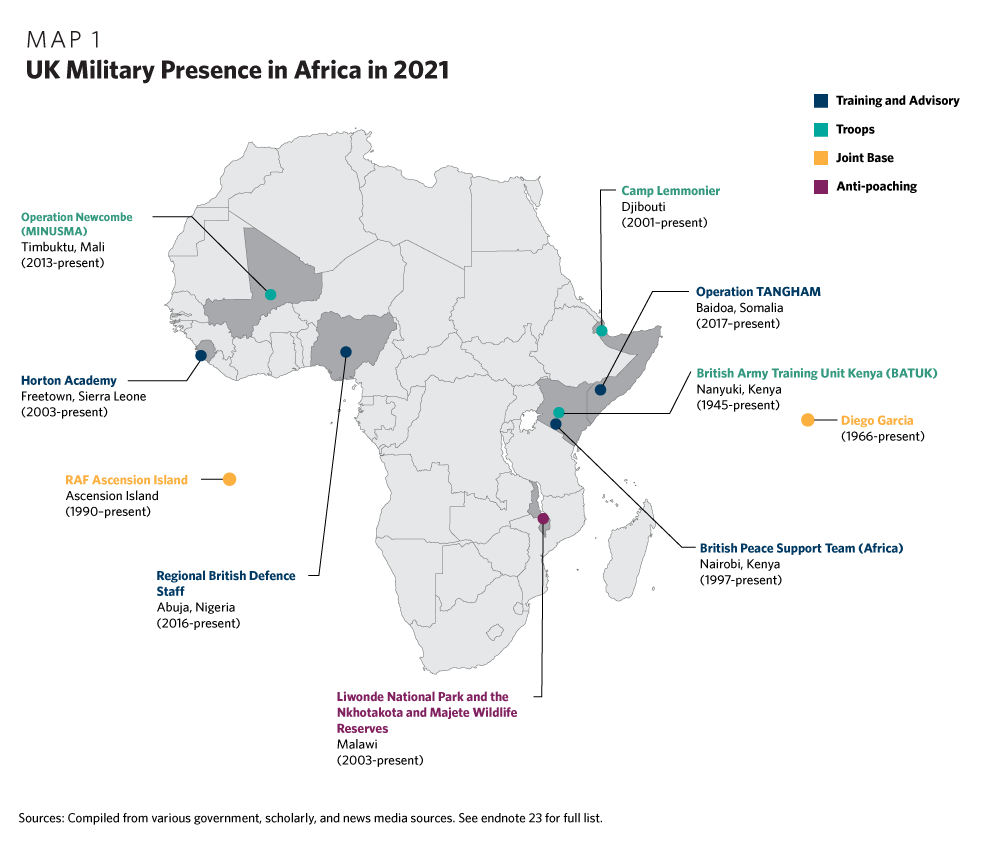 The UK already has a foundation to build upon were it to increase its military presence in Africa; it has military presence or engagement in at least ten countries and territories in Africa (see map 1).23