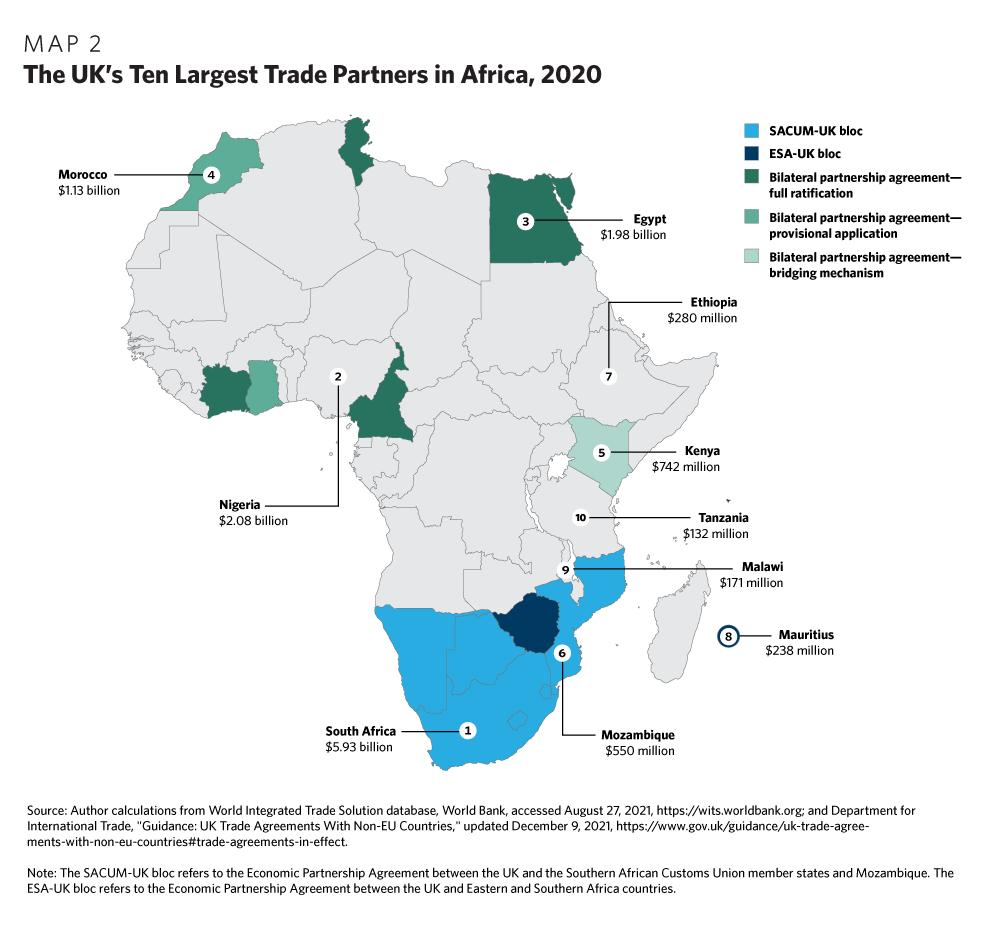 UK-Africa trade has been declining since it peaked at $43 billion in 2012, down to $14 billion in 2020. The UK is the fourth-largest bilateral donor to Africa, providing $3.9 billion in 2019