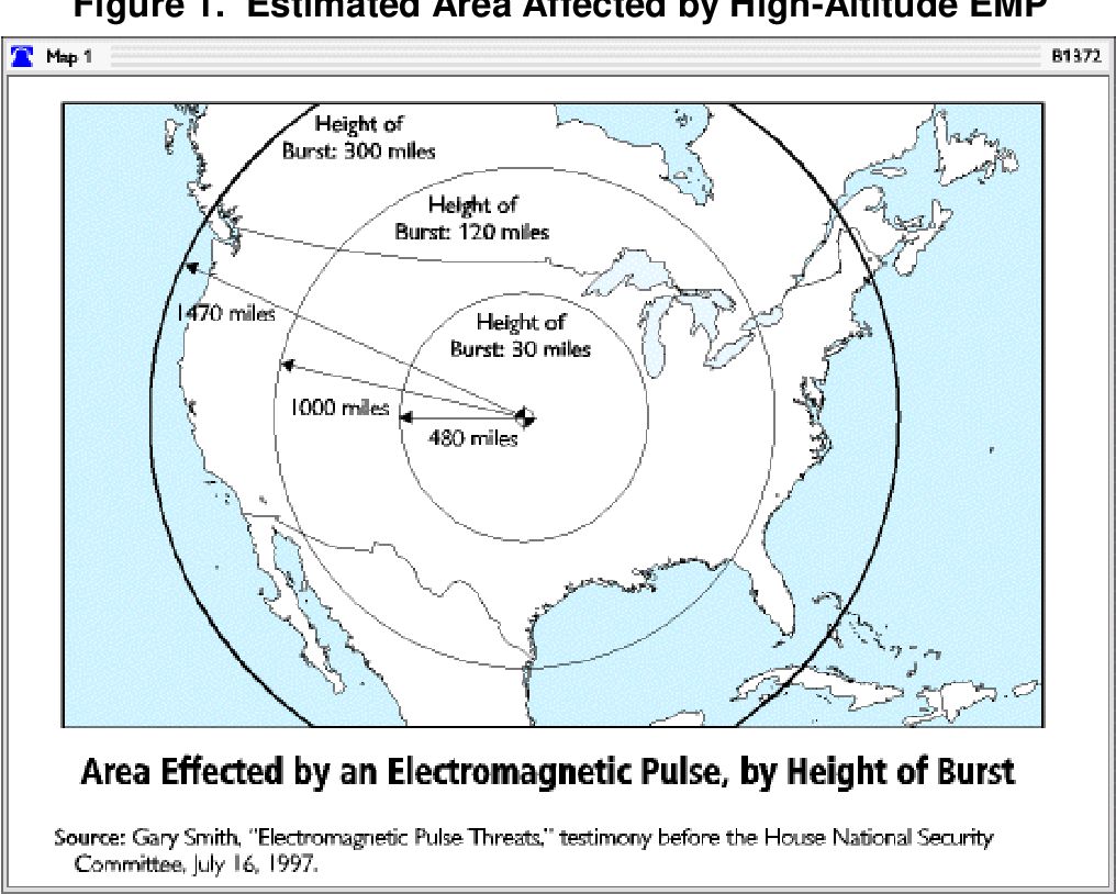 “In one billionth of a second, the initial EMP E1 wave will cause massive voltages and currents to form within power lines, telecommunication lines, cables, wires, antennas, and any other electrically conductive material found beneath the nuclear detonation in a circular area covering hundreds of thousands of square miles.