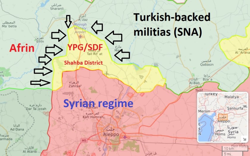 Tel Rifaat is a small enclave right near the Turkish Invasion HQ in Azaz. It is controlled precariously under shelling by the YPG/SDF and has various refugees camps like Shahba/Shebha still holding tens of thousands of Kurdish refugees from NATO/ Turkey’s invasion and ethnic cleansing of nearby Afrin, abandoned by the international West. Erdogan has repeatedly boasted he will ‘conquer’ Tel Rifaat with his Islamic mercenaries..Tonight the SDF has arrived in force to defend the refugees.(see also.. NATO okays Turkish genocide of 170K trapped Afrin refugees in Tell Rifaat/Shebha enclave– July 2022)