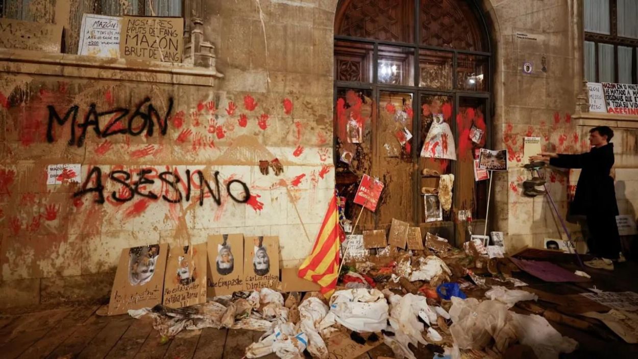 The photograph shows Valencia City Hall smeared with mud and graffiti calling the right-wing mayor a murderer.