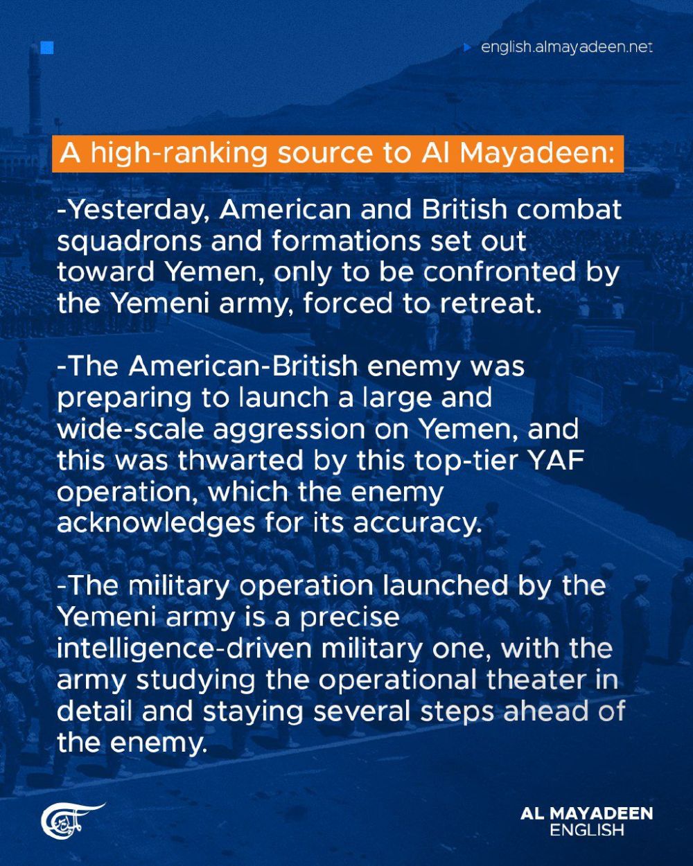 The source further revealed to Al Mayadeen that the US and British forces had been preparing for a large-scale offensive against Yemen, but the operation was thwarted by a precise and strategic military action carried out by the Yemeni Army.