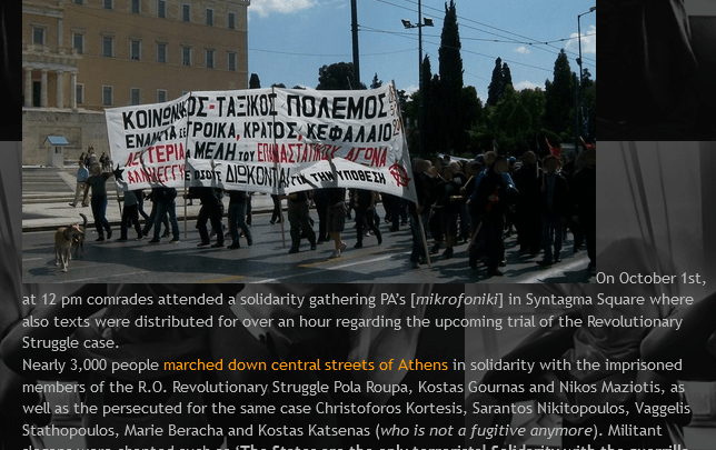 Practical solidarity: In the face of the world of the state, the bosses and the horrors of their wars, we stand in solidarity with the condemned comrades of Revolutionary Struggle, Pola Roupa and Nikos Maziotis, who through the ranks and action of the organization Revolutionary Struggle, fought steadfastly and uncompromisingly on the side of the class oppressed by the violence and terror of economic exploitation, poverty and political extermination in the sweatshops of wage slavery.