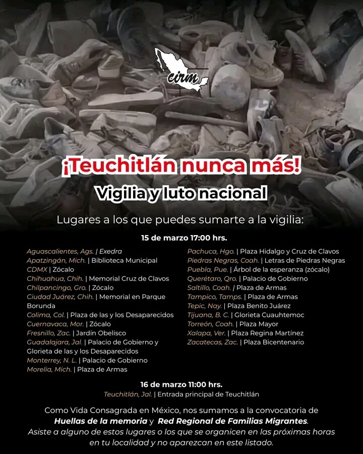 Meanwhile, in Mexico City, the Regional Network of Migrant Families and the collective Traces of Memory have called for a vigil and an act of national mourning in the Zócalo on March 15th at 5:00 p.m.