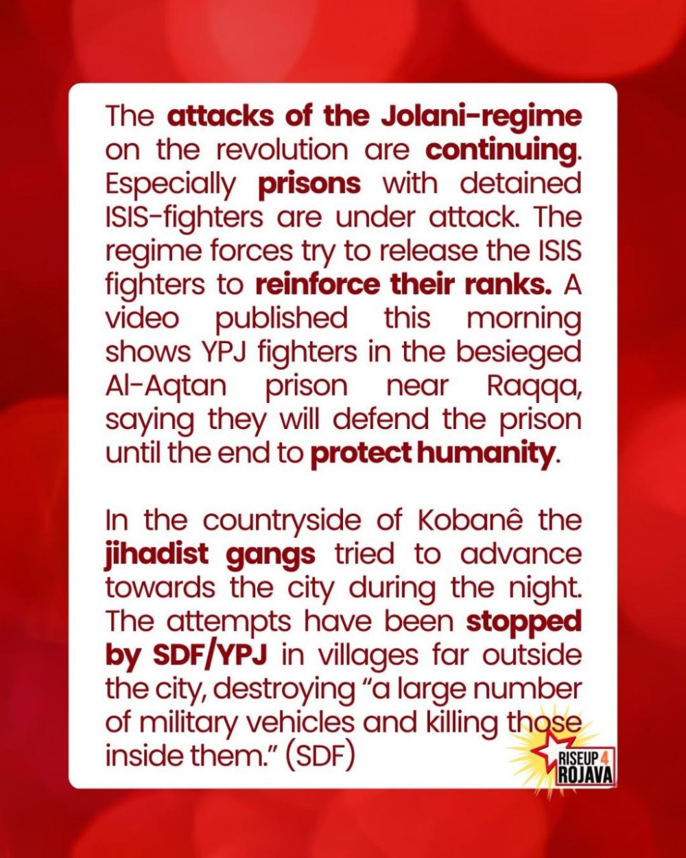 The Syrian Democratic Forces (SDF) released footage showing the moment militants of the Interim Government removed ISIS detainees from Al-Shaddadi prison.The SDF confirmed that Al-Shaddadi Prison is no longer under their control, noting that despite the prison being only two kilometers away from the International Coalition base, the coalition did not intervene despite repeated calls. The Syrian Democratic Forces (SDF) confirmed that clashes around Al-Aqtan Prison in the city of Raqqa are still ongoing, and that these clashes have resulted in the martyrdom of 9 of its fighters and the injury of 20 others..🔵
