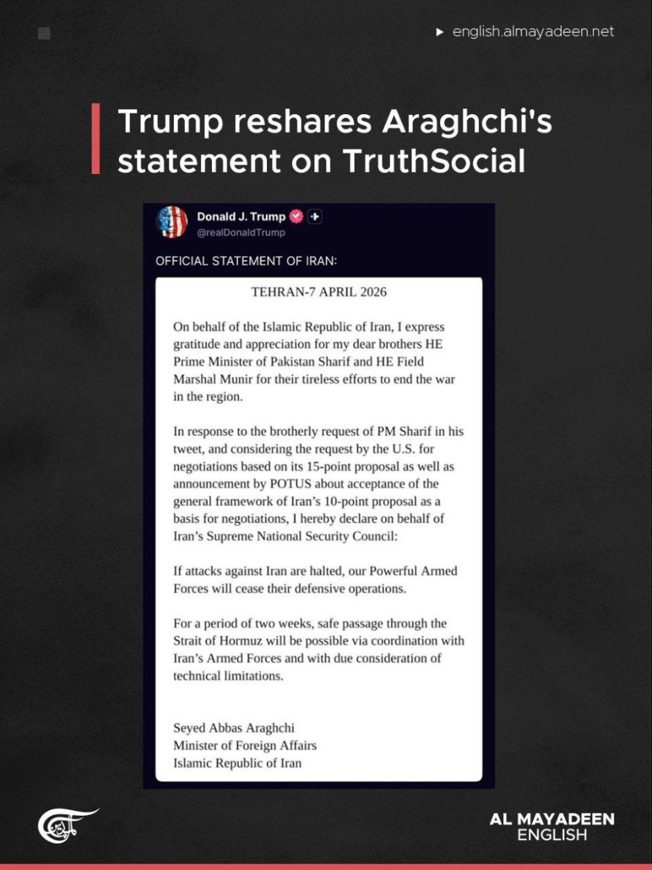 “OFFICIAL STATEMENT OF IRAN,” said Trump in the post after announcing that the US had reached a ceasefire with Iran.
