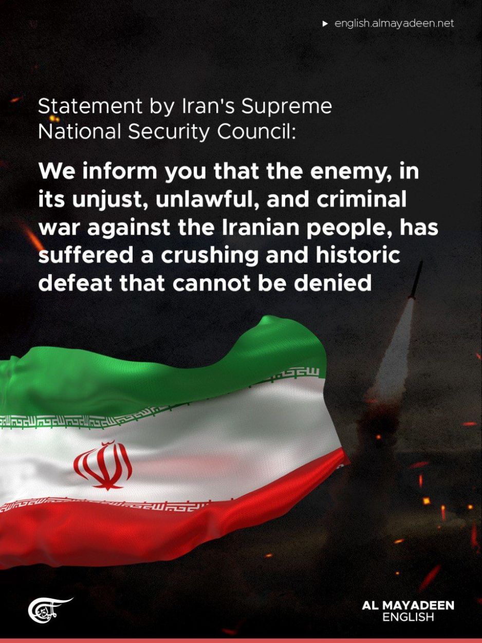 In a statement on behalf of Iran’s Supreme National Council, Iran’s FM Abbas Araghchi said that Iran will cease defensive operations once attacks against the country stop.