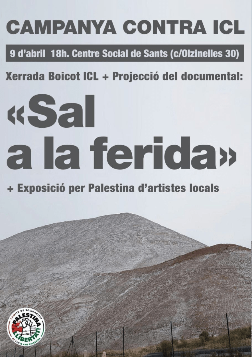 The documentary gathers the voices of people affected by ICL’s mining activity, former workers who reflect on workplace accidents and blackmail, and experts who have investigated the preferential treatment given to the company by the Catalan government and its role in the Israeli apartheid regime.