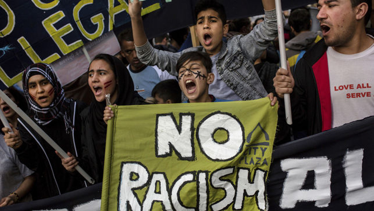 Cartell de la manifestació de suport a les nouvingudes penjat a la façana de la Casa Àfrica – Victor Serri Poster of the demonstration of support for newcomers hanging on the facade of Casa Àfrica – Victor Serri