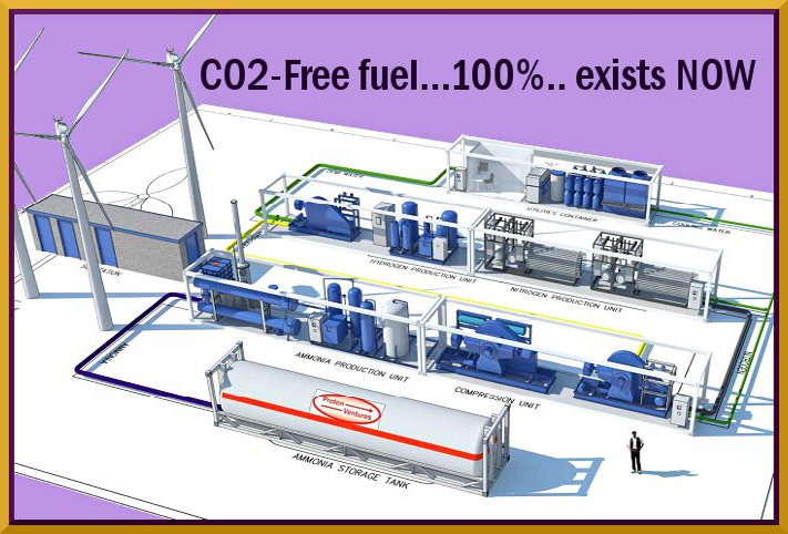 This diagram is the JACKPOT for those really seeking an answer to CO2 and Climate Change. An ‘off the shelf’ NH3 production process is CO2 free and makes a fuel that is also Co2 free and produces no toxic gases when burnt. Available from http ://www.protonchemie.com/NFUEL.html
