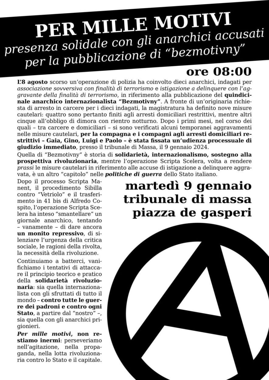 Italy: Operation ”Scripta Scelera” against the fortnightly “Bezmotivny”: first initiatives in solidarity, a brief update, some observations Act for freedom now!pdf italian :