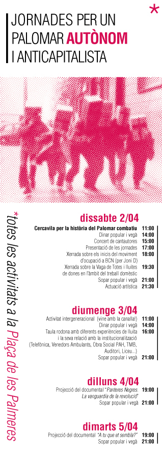 True to its name (in classical Greek “that which moves”) the Cinètika hosted during the whole weekend a whirlwind of activities that have combined cleaning and clearance of the facilities with big publiv meetings on making the independent anti capitalist Palomar barrio, a series of lectures, meals and screenings of documentaries scheduled until Tuesday.( see poster)