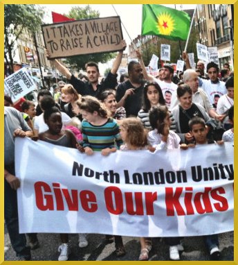 The aim was to provide a united community response to the recent disturbances, especially those in Tottenham and Hackney, and to the causes of despair and frustration that can result in riots. The march was led all the way by a dozen children behind a huge ‘Give Our Kids A Future!’ banner, followed by a mass of placards and banners from a wide range of community groups, trades union branches and political organisations as well as hand-crafted placards from scores of individuals.