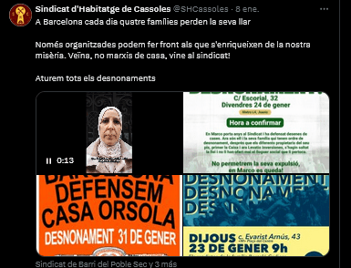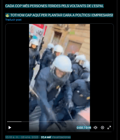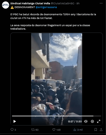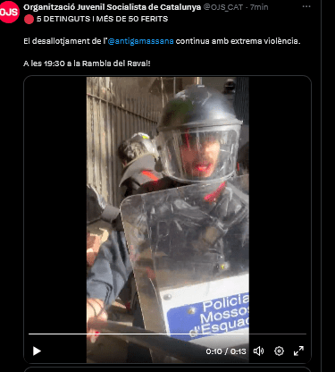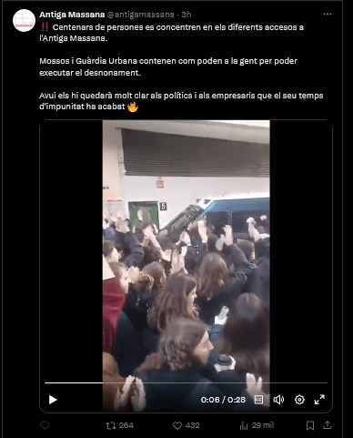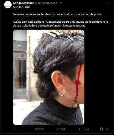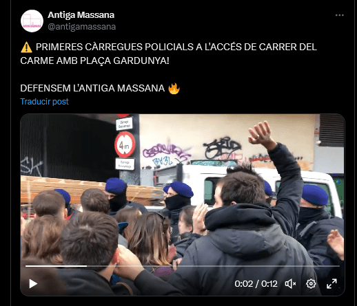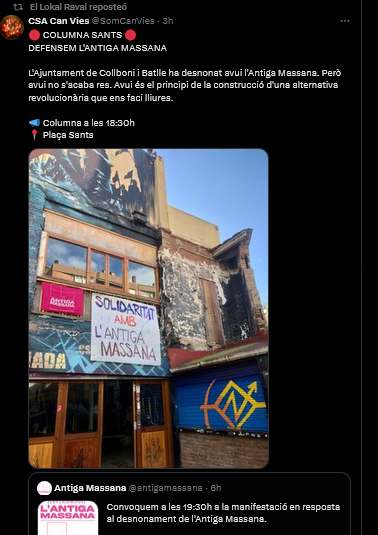 From Antiga Massana they have made an appeal through the social network X for people to gather in Plaça de la Gardunya to protest against the violent ongoing eviction of the Social Center.
