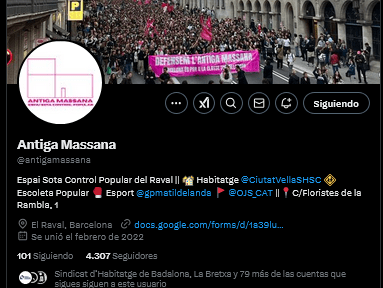 SOME ORGANISATIONS BASED IN ANTIGA MASSANA «#ConcessióAntigaMassana, Sindicat Habitatge Escoleta, 壘 Gimnas Popular, Esplai del Pi Papiro, Samidoun, OJS La Magrana, 徭 Makipomba»
