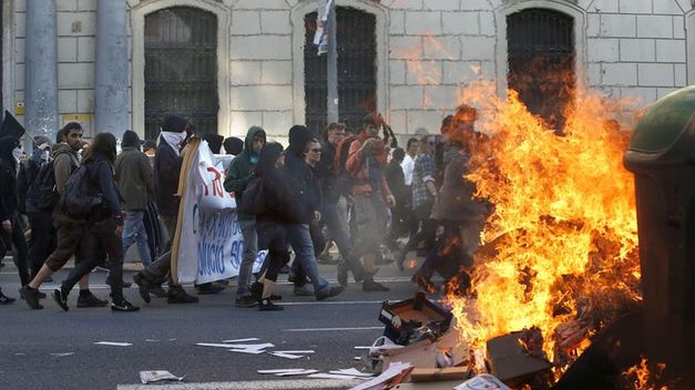 The united anti-capitalist Mayday march in Barcelona was cancelled half way through when the black block of the anarchist section began attacking banks and burning a rubbish container barricade.