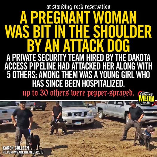Members of the Standing Rock Sioux and at least 100 other Native American nations as well as activists and advocates peacefully chanted“water is life” while guards held dogs nearby to intimidate the crowd. Without warning, these security henchmen showered the demonstrators with pepper spray and released the dogs — at least six people were bitten, including a young child.