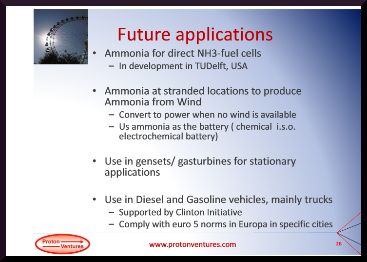 The best features of ammonia are those it shares with hydrogen: it can be used both in internal combustion engines and in fuel cells, it produces no greenhouse gasses on combustion, and it can be produced from a wide variety of renewable energy resources…..