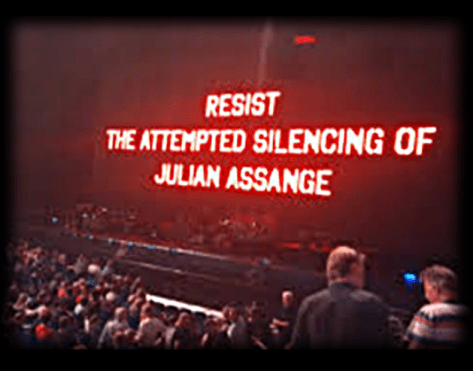 The neon red text, which read “Resist the attempted silencing of Julian Assange,” was projected onto a black backdrop before his concert on Saturday night. Waters, who is known for making radical political statements on stage, is an admirer of Assange and has previously featured images of the whistleblower in his shows.