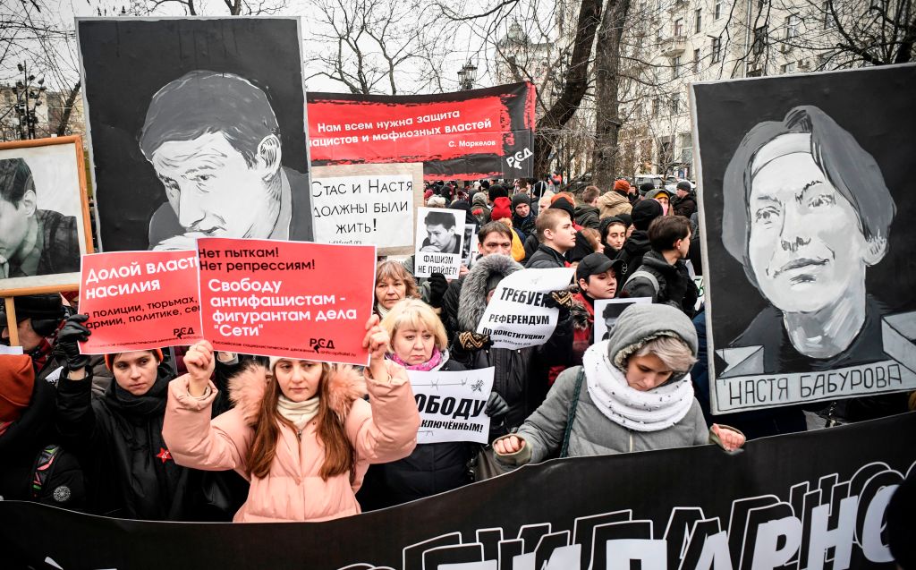 Russian opposition protestors march in central Moscow on January 19, 2020, carrying portraits of lawyer Stanislav Markelov and journalist Anastasia Baburova. – More than a thousand opposition activists of various stripes marched in central Moscow after President Vladimir Putin proposed re-drafting the constitution and unleashed a political upheaval. Protesters — mostly young anti-fascist activists — chanted “Revolution” and “No to dictatorship” and some carried copies of the constitution. The annual march was called to commemorate the memory of lawyer Stanislav Markelov and journalist Anastasia Baburova were gunned down in Moscow in 2009 by ultranationalists. (Photo by Alexander NEMENOV / AFP) (Photo by ALEXANDER NEMENOV/AFP via Getty Images)