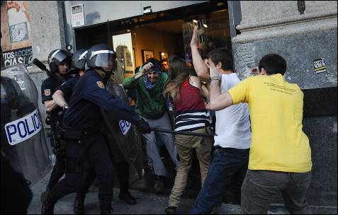 “Detenidos, heridos, empujados…. Nos tienen prisioneros en una calle !!!!” así twitteaba @Watermelonparty en directo lo que estaban viviendo las cerca de 200 personas que habían acampado en la Puerta del Sol tras la marcha celebrada el domingo a iniciativa de la plataforma Democracia real ya.