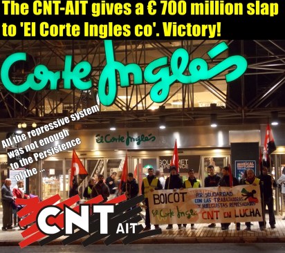 Tarcoteca Translation of: http:/…cnt-de-barcelona-pega-… The Union Section of CNT through the ‘Department of Territory and Sustainability of the Catalonian Generalitat’ [regional government agency] has managed, after 6 years in conflict, to get a ban on contracts with the Computing Dept of the Corte Inglés’ (IECISA) by the public sector for 3 years. Continue reading “The CNT-AIT Barcelona deals a 700 million Blow to El Corte Ingles. Victory!”